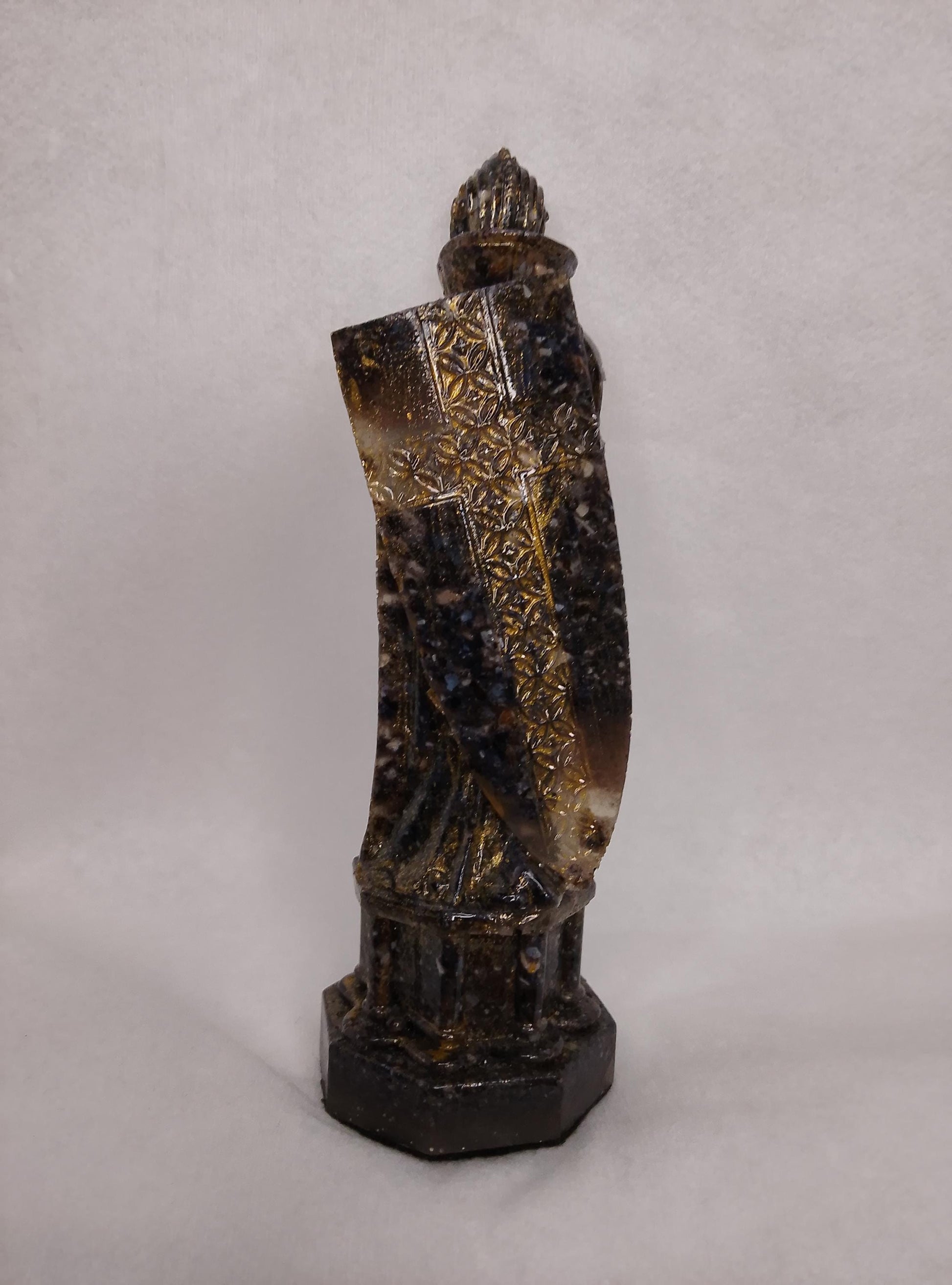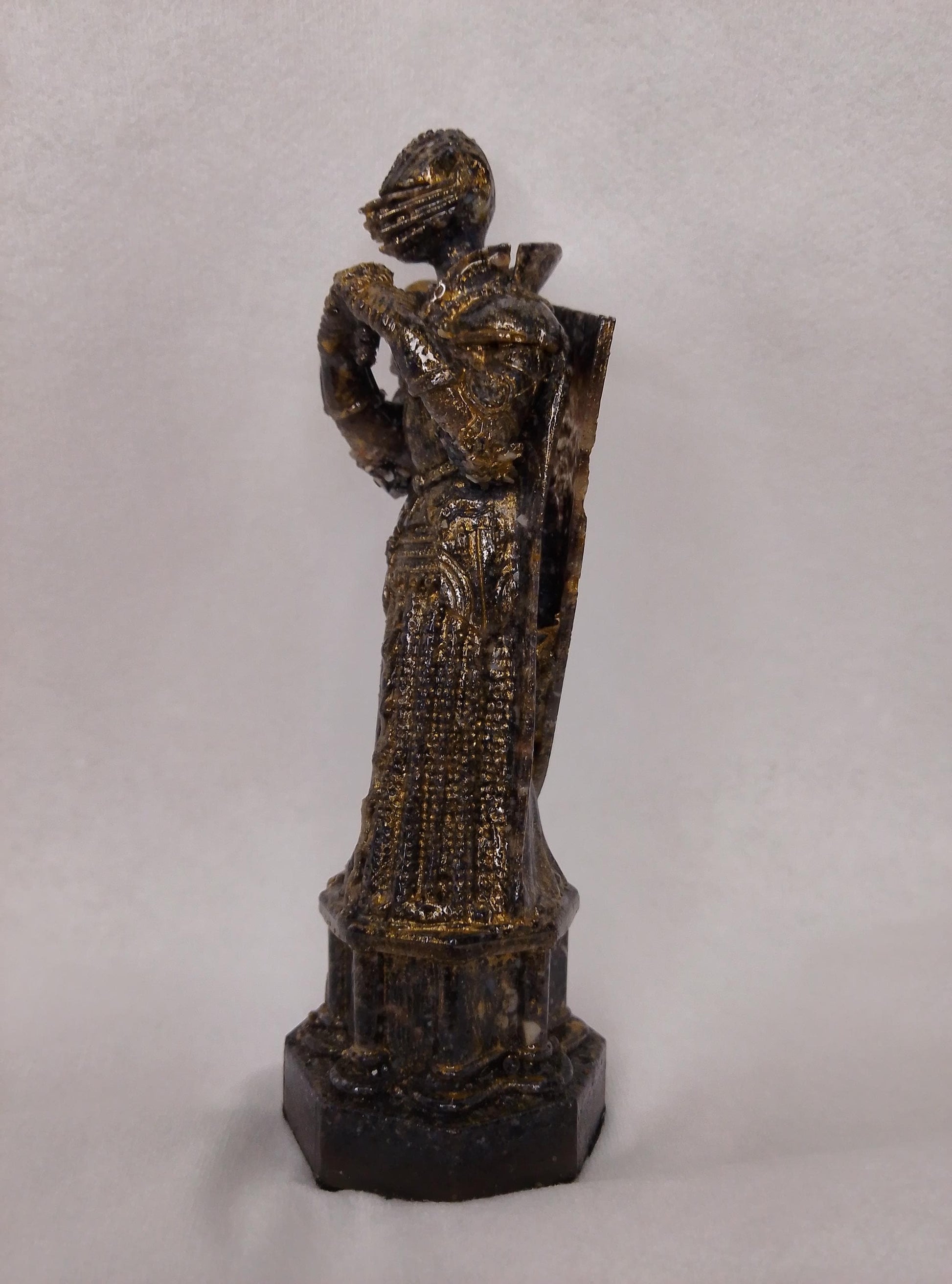 Каждая фигурка отлита вручную из смолы и натурального порошка из ракушек, что придает ей текстуру, похожую на камень, и мягкий металлический блеск, который меняется в зависимости от света. Подробные узоры доспехов и плащей отражают элегантность и силу.