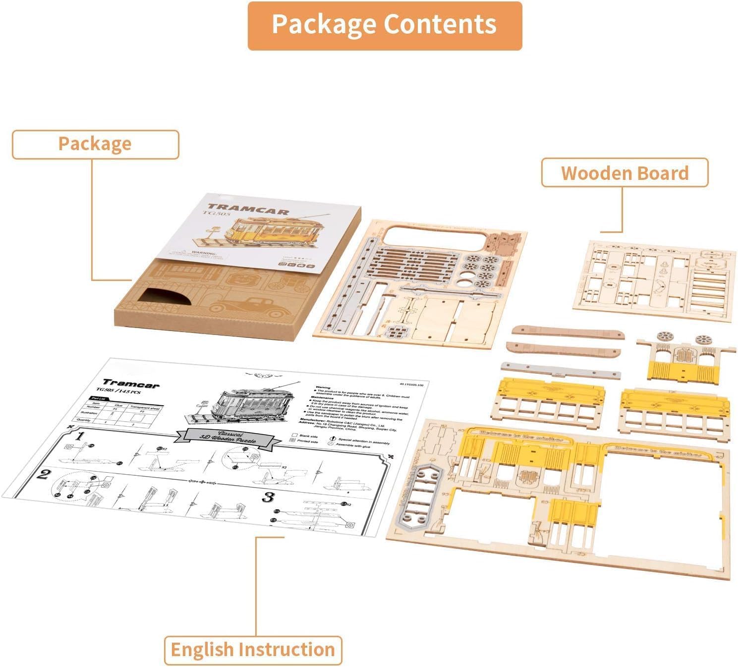 ROBOTIME 3D Puzzle Tram Car Wooden Model Kits TG505